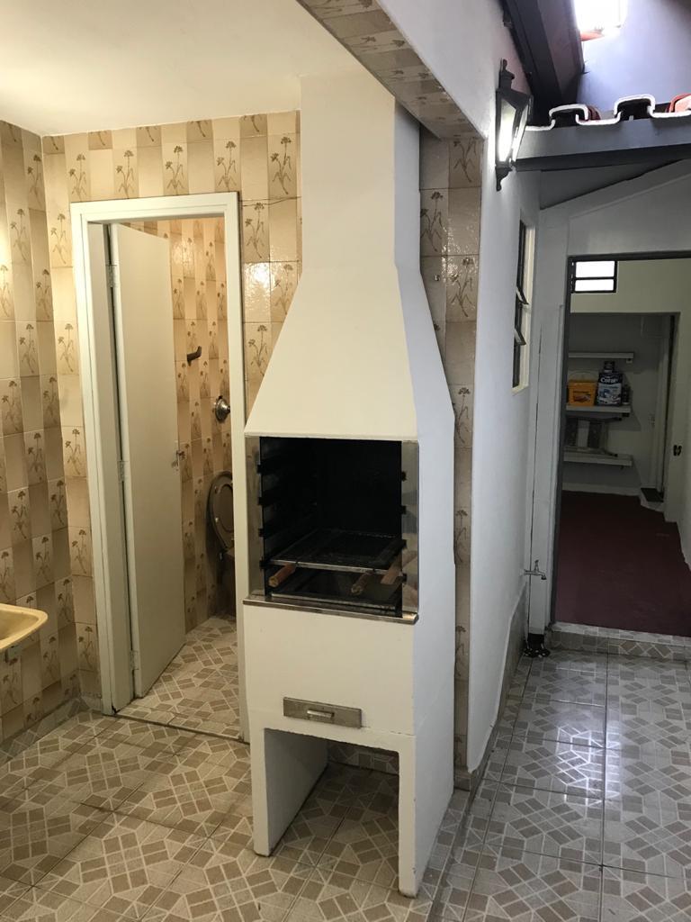 Quintal com churrasqueira e garagem para carros.