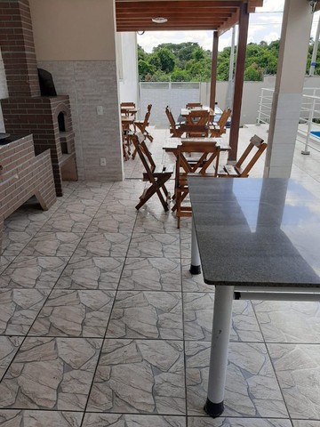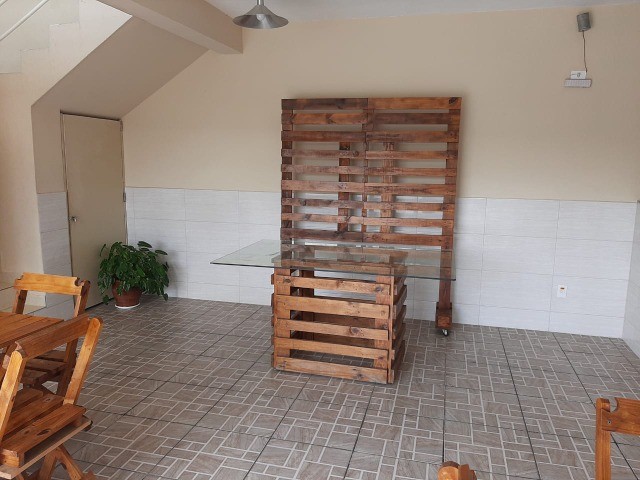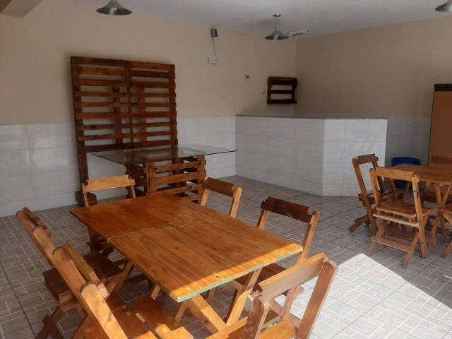 - 10 conjuntos de mesas com 40 cadeiras e 2 mesas grandes (uma de pedra e outra de vidro que acompanha um painel para decoração)